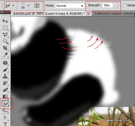 - Download hair brushes. Choose Smudge Tool and one of the hair brush. Adjust strength 70%. Move this tool from inside part to the panda color spots to edgest. Try different size brushes to find which one is working better for different areas.