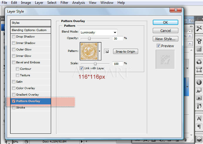 - Apply free transformation to created rectangle, make it 116*116px and create a new pattern (Edit > Define pattern).