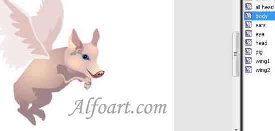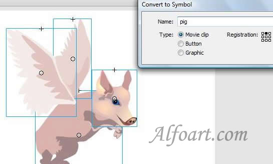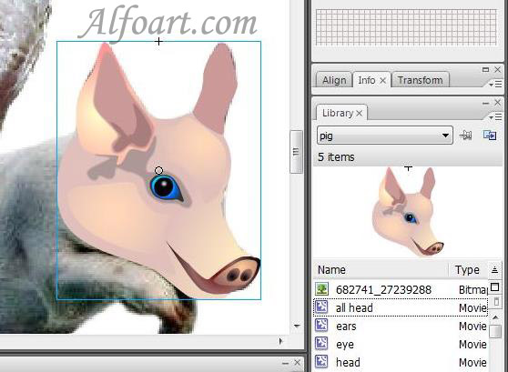 Create Movie Clip including all parts of the object. It is required for the pig's moving on the set trajectory. Name the Movie Clip "Pig".