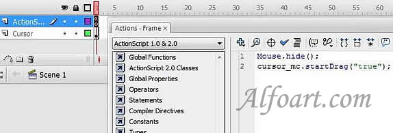 - Right click the cursor movie clip, and insert the following script.