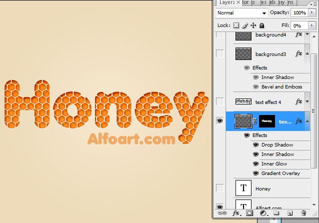 - Create a new empty layer above text, fill it with "Honeycomb" pattern.