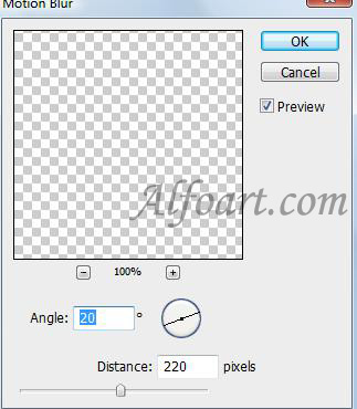 - Go to Blur > Motion Blur (Angle: 20, Distance: 220).