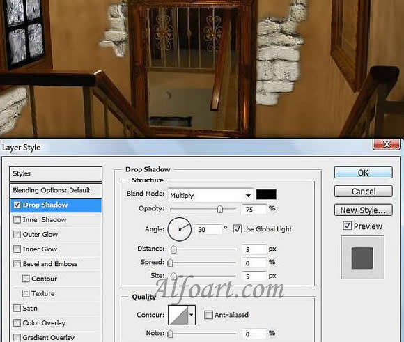 - Right click on the layer with the room, select Blending options > Drop shadow.