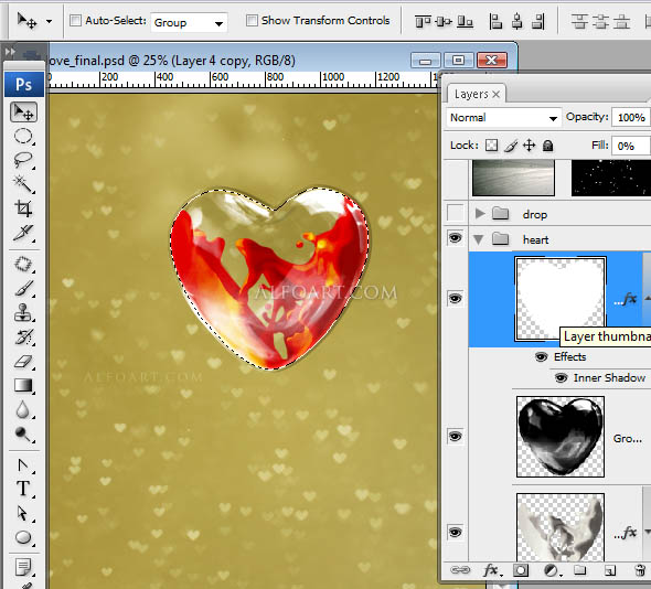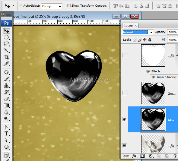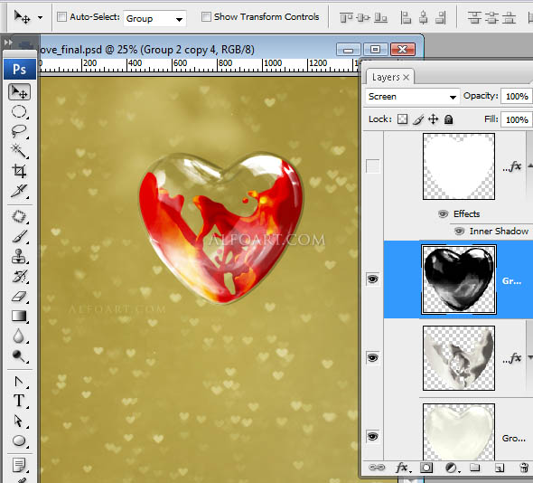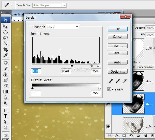 - Play with levels settings and make heart very dark, but with a few white spots.