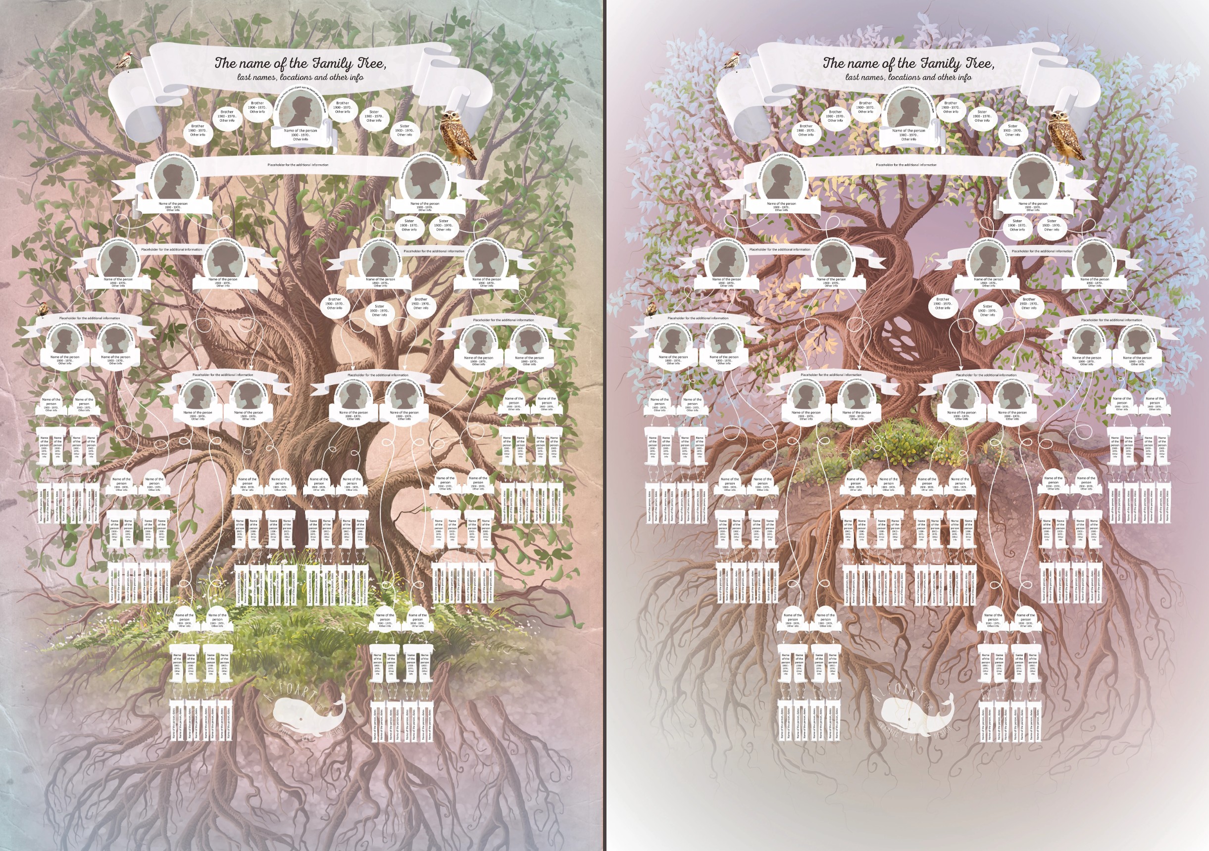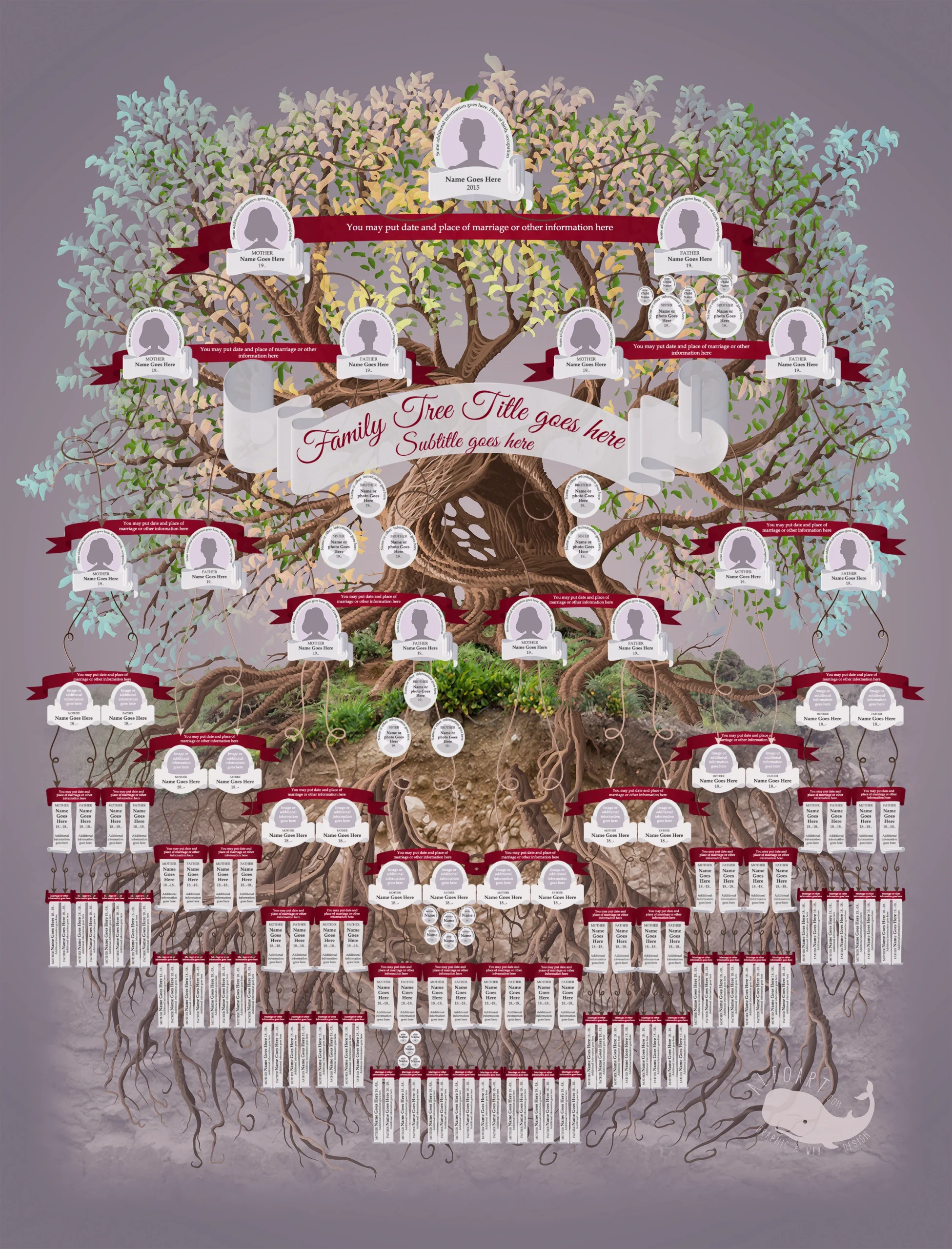 This high-resolution, multi-layered family tree template includes all elements on separate layers. You can add images to the ovals containing the names. Download PSD file (1 GB)