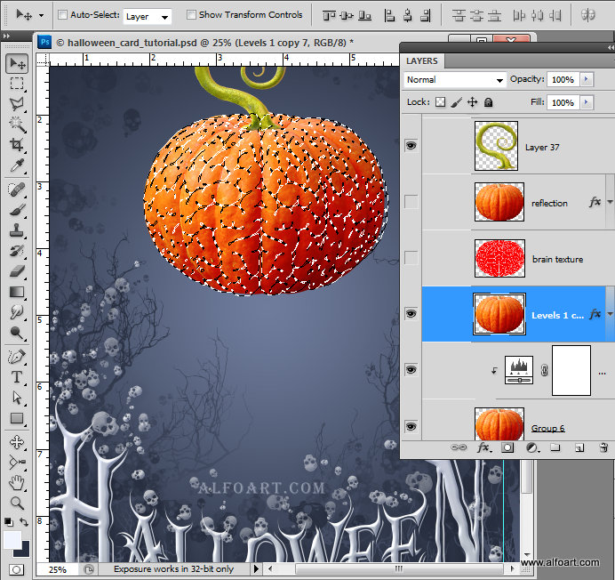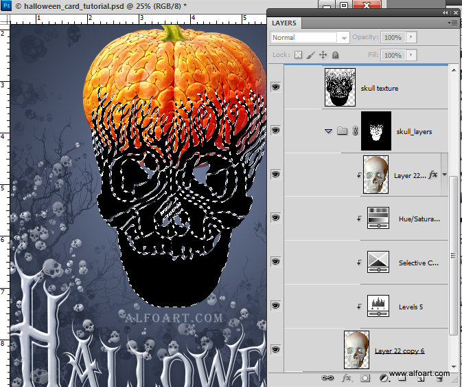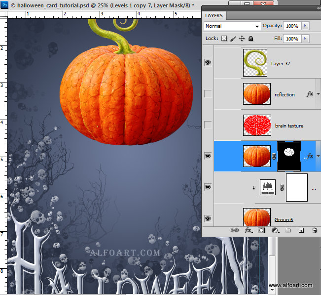 - Make active and visible second pumpkin layer, place it above the dark one. Then place the brains texture shape above the pumpkin. We need this shape to load selection of this texture. So load selection (Ctrl + Click texture) shape thumbnail. Keep selection, return to the pumpkin layer and add Layer Mask to it.