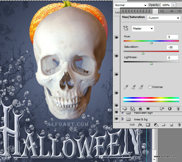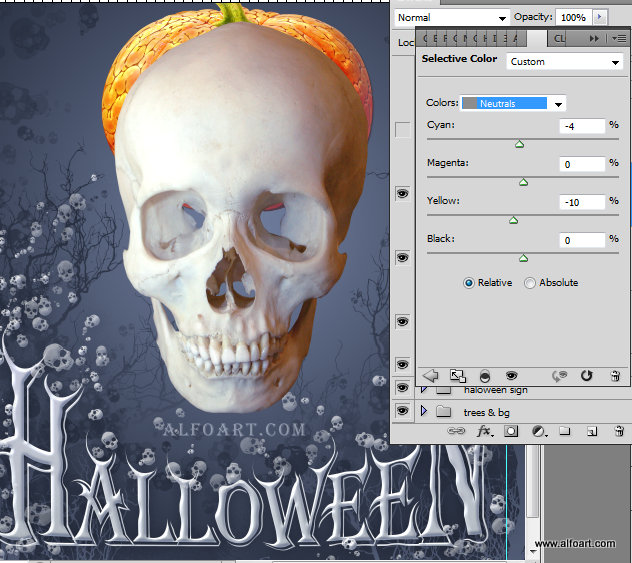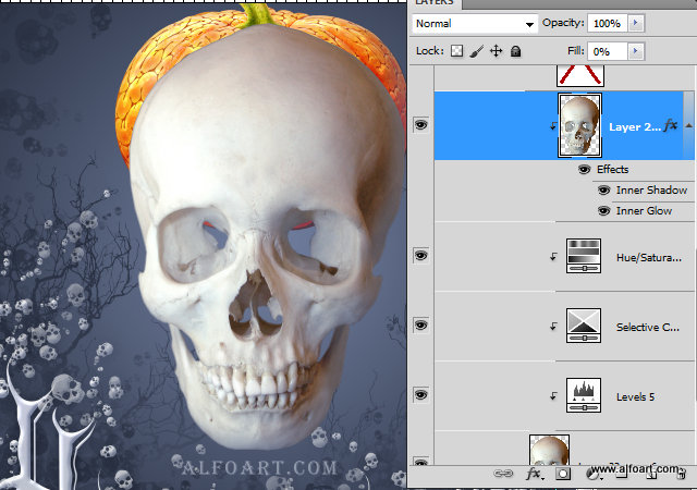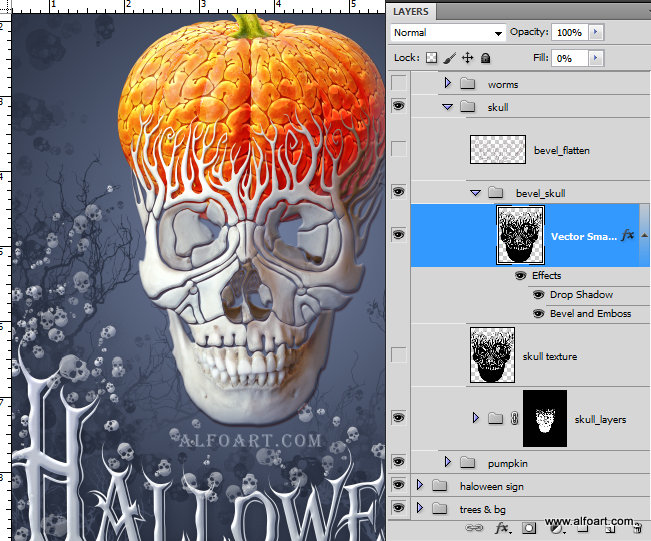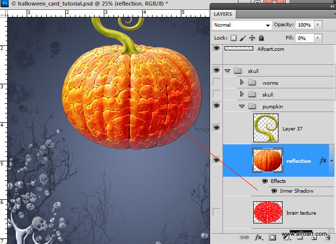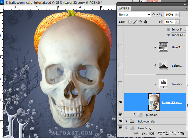 - Duplicate skull layer and apply similar background reflections effects as for the pumpkin previously.