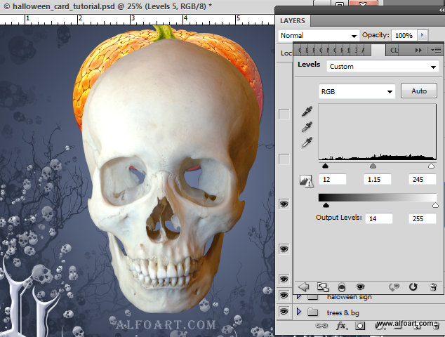 - Correct levels adjustments. You may use adjustments layers for all skull corrections. Convert used adjustment layers to Clipping Masks. Right click adjustment layer > choose "Create Clipping Mask".