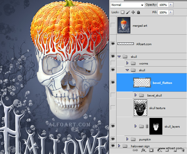 - Merge texture layer with the new empty layer and erase the bottom part below the pumpkin in order to keep emboss effect only in the pumpkin shape area.
