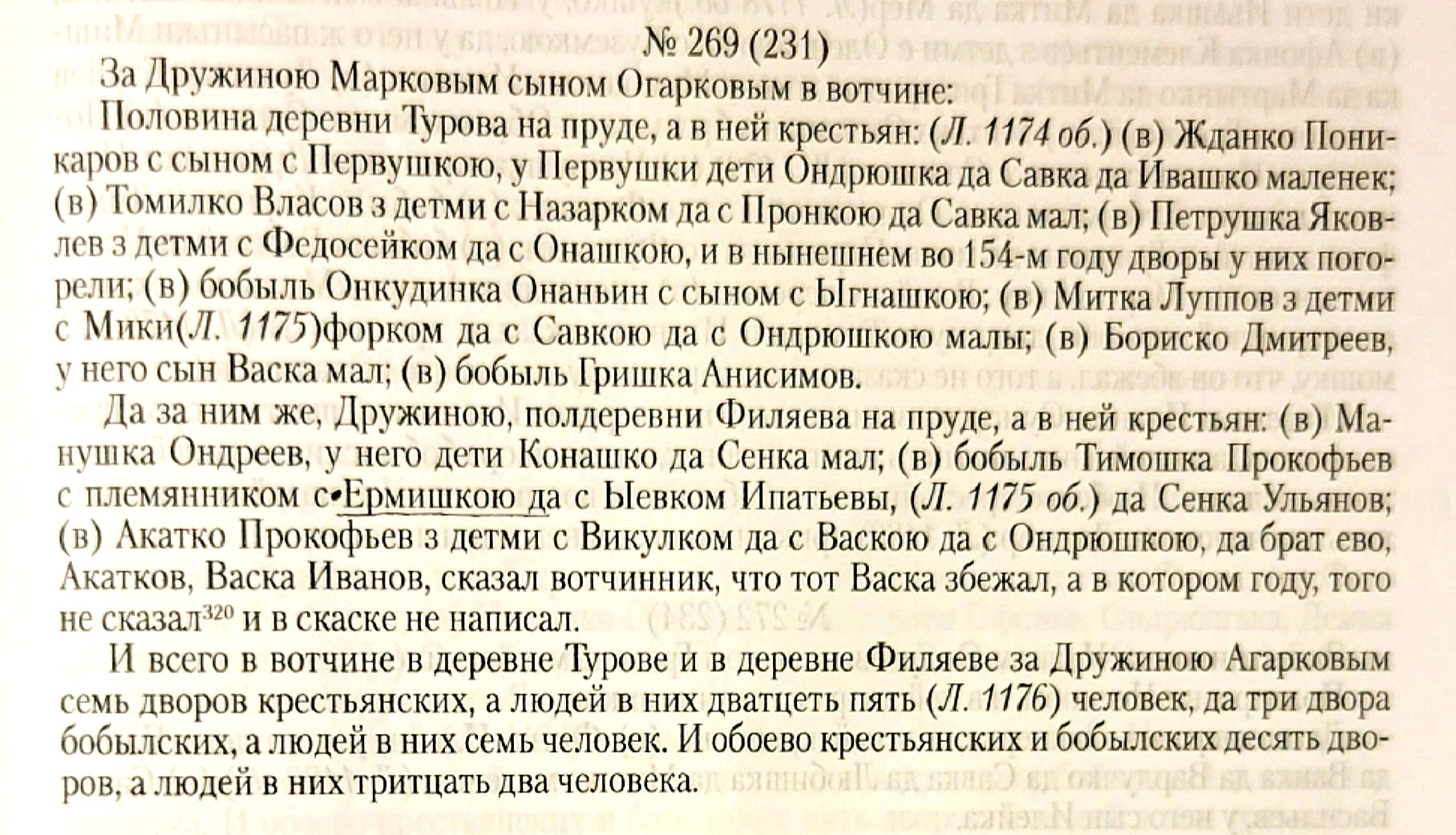 За Дружиною Марковым сыном Огарковым в вотчине:Половина деревни Турова на пруде, а в ней крестьян: (Л. 1174 об.) (в) Жданко Пони-